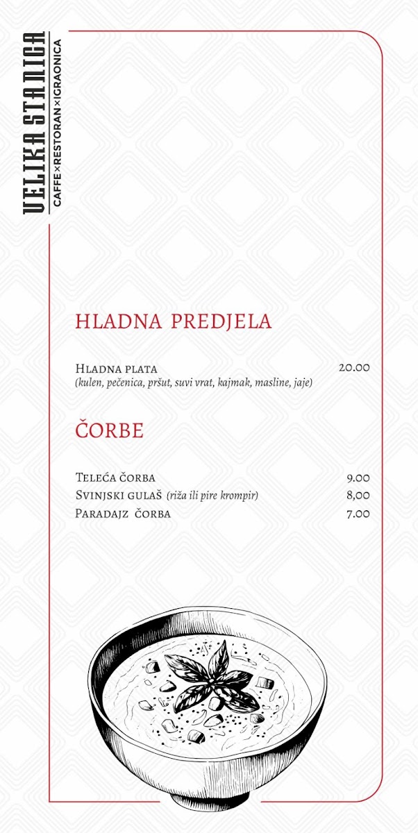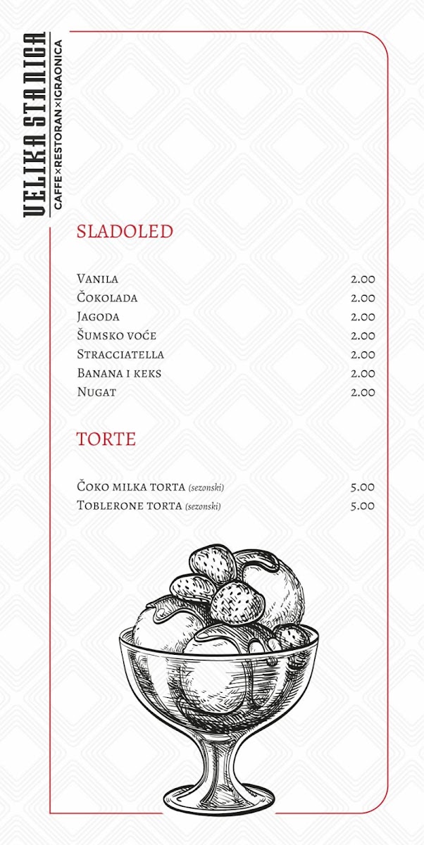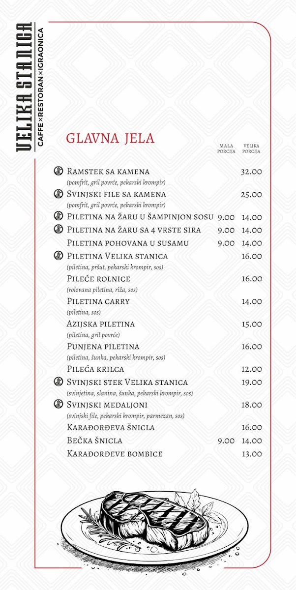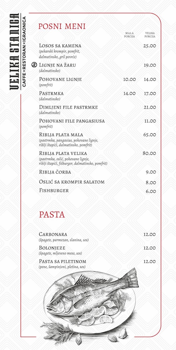Dining at Mala Stanica (Sremska 2, Bijeljina 76300, Bosnia & Herzegovina) feels like flipping through a menu that’s built for groups with different cravings-seafood lovers, grill fans, pasta-and-pizza regulars, and anyone saving room for dessert. The meat-free “Posni” selection leans into the Adriatic vibe with Losos, LIGNJE NA ŽARU, POHOVANE LIGNJE, PASTRMKA NA ŽARU, and OSLIĆ SA KROMPIR SALATOM, which gives you plenty of lighter, fish-forward options. If you want comfort classics, the pasta section keeps it simple and familiar-CARBONARE, BOLONJEZE, and PASTA SA PILETINOM-while pizza stretches from the crowd-friendly CAPRICCIOSA to house-style picks like PIZZA VELIKA STANICA, DIAVOLA, PIZZA ŠEFA KUHINJE, and PIZZA SA PILETINOM. The grill lineup is clearly a backbone here, with local favorites such as ĆEVAPI MALI, ĆEVAPI VELIKI, ĆEVAPČIĆI U KAJMAKU, PUNJENI ĆEVAP, and ROŠTILJSKE KOBASICE, alongside hearty mains like RAMŠTEK SA KAMENOM, SVINJSKI FILE SA KAMENOM, PILETINA NA ŽARU U ŠAMPINJON SOSU, PILETINA NA ŽARU SA 4 VRSTE SIRA, and PILETINA POHOVANA U SUSAMU. Starters and sides round things out neatly-HLADNA PLATA, soups like TELEĆA ČORBA, SVINJSKI GULAŠ, PARADAJZ ČORBA, salads including CEZAR OBROK SALATA, TUNA SALATA, GRČKA SALATA, ŠOPSKA SALATA, SEZONSKA SALATA MIX, plus add-ons like POMFRIT 200g, GRILOVANO POVRĆE 200g, KAJMAK 50g, PEKARSKI KROMPIR 200g, and PECIVO (4 komada). Breakfast and quick bites-JAJA NA OKO SA ROŠTILJSKOM KOBASICOM, JAJA NA OKO SA SLANINOM, JAJA NA OKO SA PEČENICOM, OMLET SLANINA, OMLET PEČENICA, PIZZA SENDVIČ MIX, SENDVIČ TUNA, SENDVIČ SA PILETINOM, POHOVANI PALAČINAK, and TORTILIJA SA PILETINOM-make it easy to drop in anytime. And if you’re ending sweet, you’ve got everything from VANILA, ČOKOLADA, JAGODAŠUMSKO VOĆE, STRACATELA ice cream to cakes like ČOKO MILKA TORTA and TOBLERONE TORTA, plus desserts such as TRI LEĆE, CHEASECAKE, BROŠ OD JABUKAČOKOLADNI SUFLE, and PALAČINKE-a strong finish to a menu that’s broad, approachable, and built around crowd-pleasing staples.
