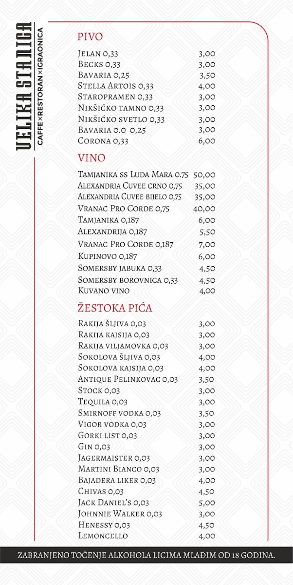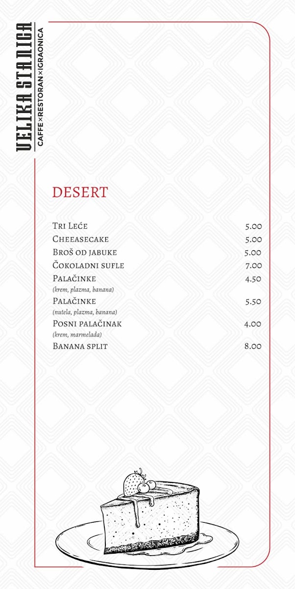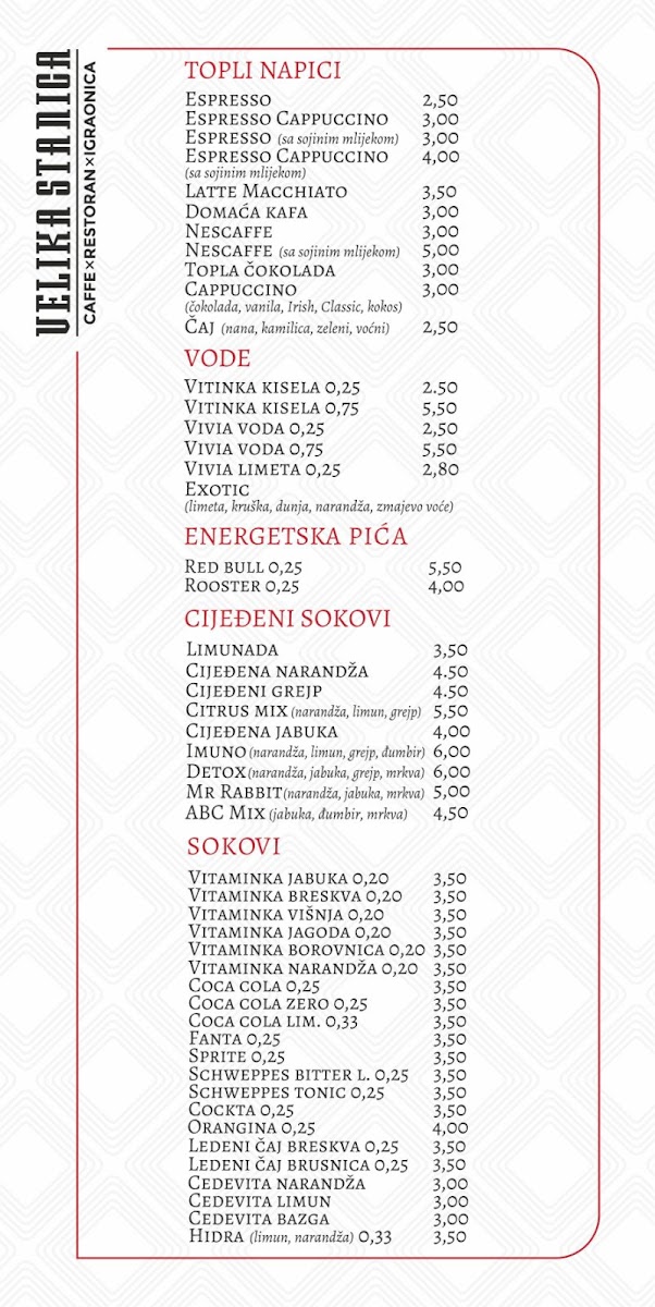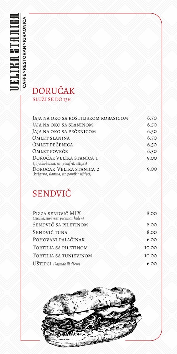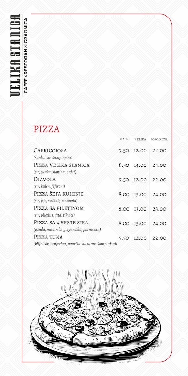 Dining at Mala Stanica (Sremska 2, Bijeljina 76300, Bosnia & Herzegovina) feels like flipping through a menu that’s built for groups with different cravings-seafood lovers, grill fans, pasta-and-pizza regulars, and anyone saving room for dessert. The meat-free “Posni” selection leans into the Adriatic vibe with Losos, LIGNJE NA ŽARU, POHOVANE LIGNJE, PASTRMKA NA ŽARU, and OSLIĆ SA KROMPIR SALATOM, which gives you plenty of lighter, fish-forward options. If you want comfort classics, the pasta section keeps it simple and familiar-CARBONARE, BOLONJEZE, and PASTA SA PILETINOM-while pizza stretches from the crowd-friendly CAPRICCIOSA to house-style picks like PIZZA VELIKA STANICA, DIAVOLA, PIZZA ŠEFA KUHINJE, and PIZZA SA PILETINOM. The grill lineup is clearly a backbone here, with local favorites such as ĆEVAPI MALI, ĆEVAPI VELIKI, ĆEVAPČIĆI U KAJMAKU, PUNJENI ĆEVAP, and ROŠTILJSKE KOBASICE, alongside hearty mains like RAMŠTEK SA KAMENOM, SVINJSKI FILE SA KAMENOM, PILETINA NA ŽARU U ŠAMPINJON SOSU, PILETINA NA ŽARU SA 4 VRSTE SIRA, and PILETINA POHOVANA U SUSAMU. Starters and sides round things out neatly-HLADNA PLATA, soups like TELEĆA ČORBA, SVINJSKI GULAŠ, PARADAJZ ČORBA, salads including CEZAR OBROK SALATA, TUNA SALATA, GRČKA SALATA, ŠOPSKA SALATA, SEZONSKA SALATA MIX, plus add-ons like POMFRIT 200g, GRILOVANO POVRĆE 200g, KAJMAK 50g, PEKARSKI KROMPIR 200g, and PECIVO (4 komada). Breakfast and quick bites-JAJA NA OKO SA ROŠTILJSKOM KOBASICOM, JAJA NA OKO SA SLANINOM, JAJA NA OKO SA PEČENICOM, OMLET SLANINA, OMLET PEČENICA, PIZZA SENDVIČ MIX, SENDVIČ TUNA, SENDVIČ SA PILETINOM, POHOVANI PALAČINAK, and TORTILIJA SA PILETINOM-make it easy to drop in anytime. And if you’re ending sweet, you’ve got everything from VANILA, ČOKOLADA, JAGODAŠUMSKO VOĆE, STRACATELA ice cream to cakes like ČOKO MILKA TORTA and TOBLERONE TORTA, plus desserts such as TRI LEĆE, CHEASECAKE, BROŠ OD JABUKAČOKOLADNI SUFLE, and PALAČINKE-a strong finish to a menu that’s broad, approachable, and built around crowd-pleasing staples.
